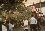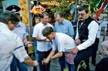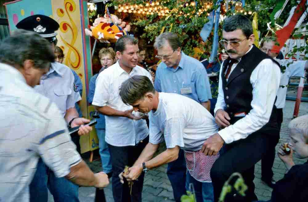 Anschließend graben die Vertreter der Ausschankstellen die Kerwe aus. Hoffentlich sind die Weinflaschen aus dem letzten Jahr noch an ihrem Platz, damit sie poliert und probiert werden können. Ist der Wein noch genießbar, werden damit nach alter Tradition die Kerwesträuße begossen. Ebenfalls traditionsgemäß werden wieder eins der ältesten und das jüngste Ehepaar geehrt.