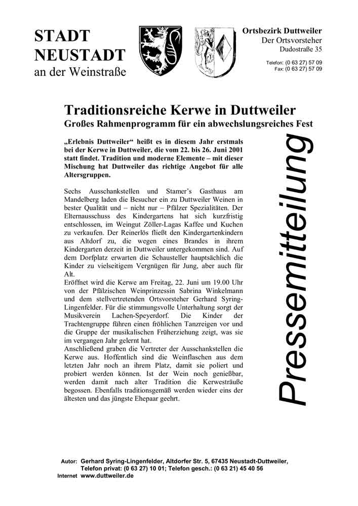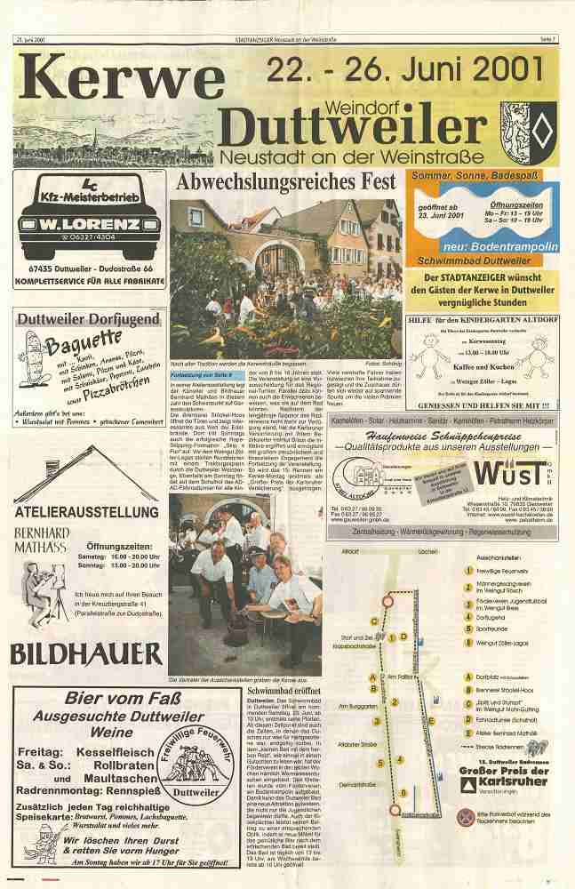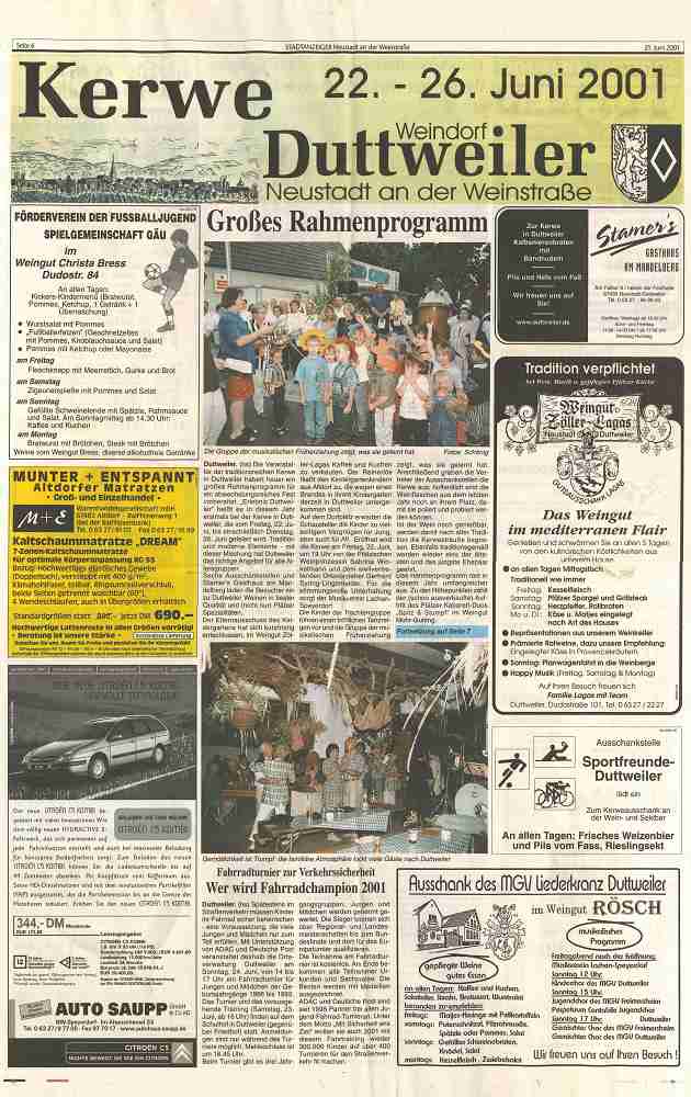 "Erlebnis Duttweiler" heißt es in diesem Jahr erstmals bei der Kerwe in Duttweiler, die vom 22. bis 26. Juni 2001 statt findet. Tradition und moderne Elemente - mit dieser Mischung hat Duttweiler das richtige Angebot für alle Altersgruppen.