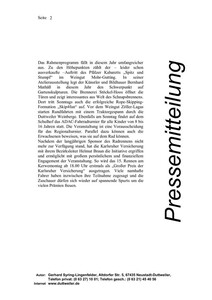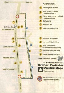 Das Rahmenprogramm fällt in diesem Jahr umfangreicher aus. Zu den Höhepunkten zählt der - leider schon ausverkaufte -Auftritt des Pfälzer Kabaretts "Spitz und Stumpf" im Weingut Mohr-Gutting. In seiner Atelierausstellung legt der Künstler und Bildhauer Bernhard Mathäß in diesem Jahr den Schwerpunkt auf Gartenskulpturen. Die Brennerei Stöckel-Hoos öffnet die Türen und zeigt interessantes aus Welt des Schnapsbrennens. Dort tritt Sonntags auch die erfolgreiche Rope-Skipping-Formation "Skip4fun" auf. Vor dem Weingut Zöller-Lagas starten Rundfahrten mit einem Traktorgespann durch die Duttweiler Weinberge. Ebenfalls am Sonntag findet auf dem Schulhof das ADAC-Fahrradturnier für alle Kinder von 8 bis 16 Jahren statt. Die Veranstaltung ist eine Vorausscheidung für das Regionalturnier. Parallel dazu können auch die Erwachsenen beweisen, was sie auf dem Rad können. Nachdem der langjährigen Sponsor des Radrennens nicht mehr zur Verfügung stand, hat die Karlsruher Versicherung mit ihrem Bezirksleiter Helmut Braun die Initiative ergriffen und ermöglicht mit großem persönlichem und finanziellem Engagement der Veranstaltung. So wird das 15. Rennen am Kerwemontag ab 18.00 Uhr erstmals als "Großer Preis der Karlsruher Versicherung" ausgetragen. Viele namhafte Fahrer haben inzwischen ihre Teilnahme zugesagt und die Zuschauer dürfen sich wieder auf spannende Spurts um die vielen Prämien freuen.