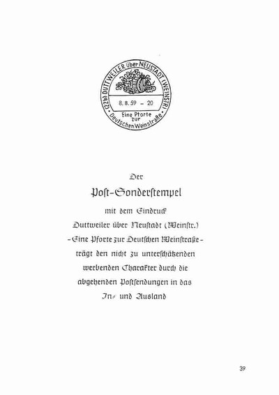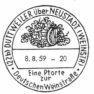 Aus Anlass des Weinfestes hat die Post einen Sonderstempel aufgelegt. In Postamt Duttweiler wurden damit die ausgehenden Briefe gestempelt. Der Stempel trägt die Aufschrift "(22b) Duttweiler über Neustadt (Weinstr) - Eine Pforte zur Deutschen Weinstraße.