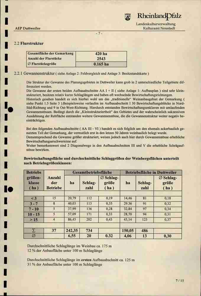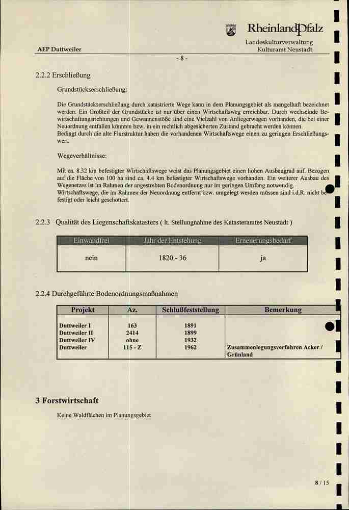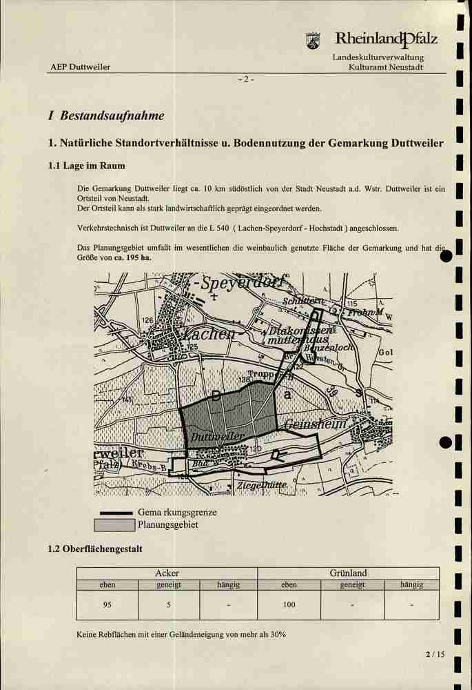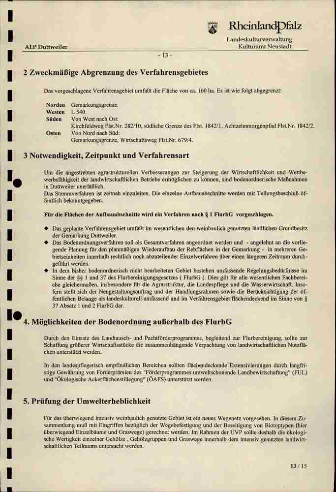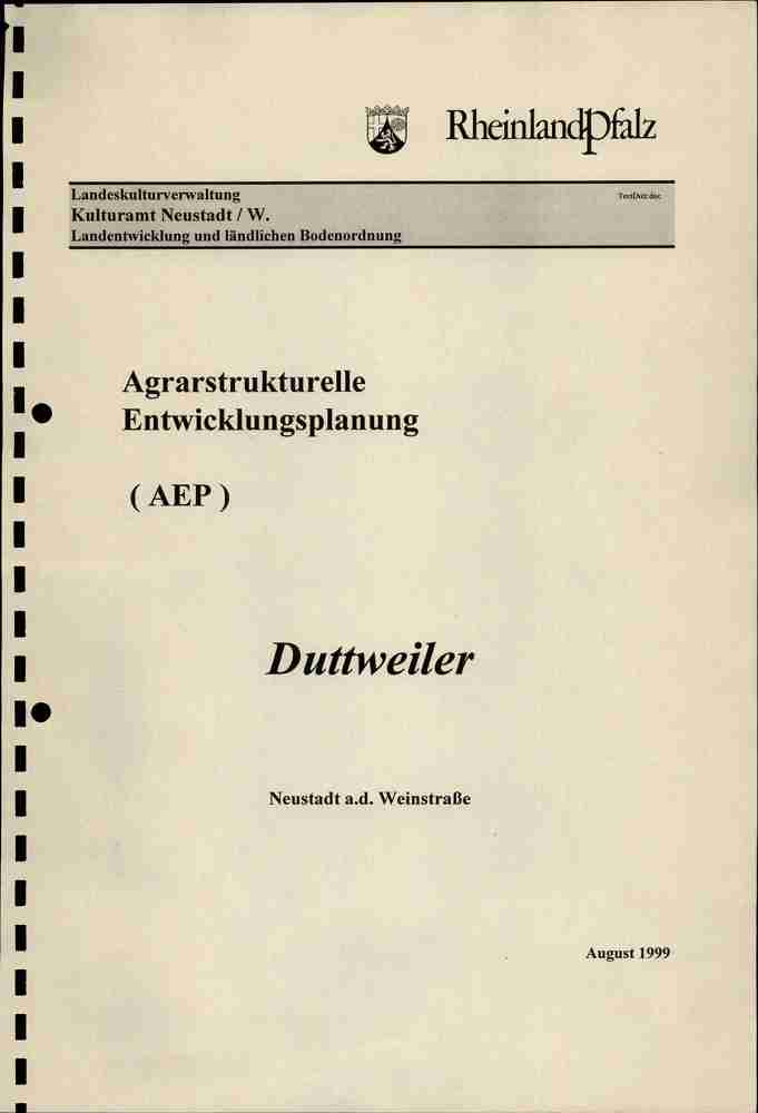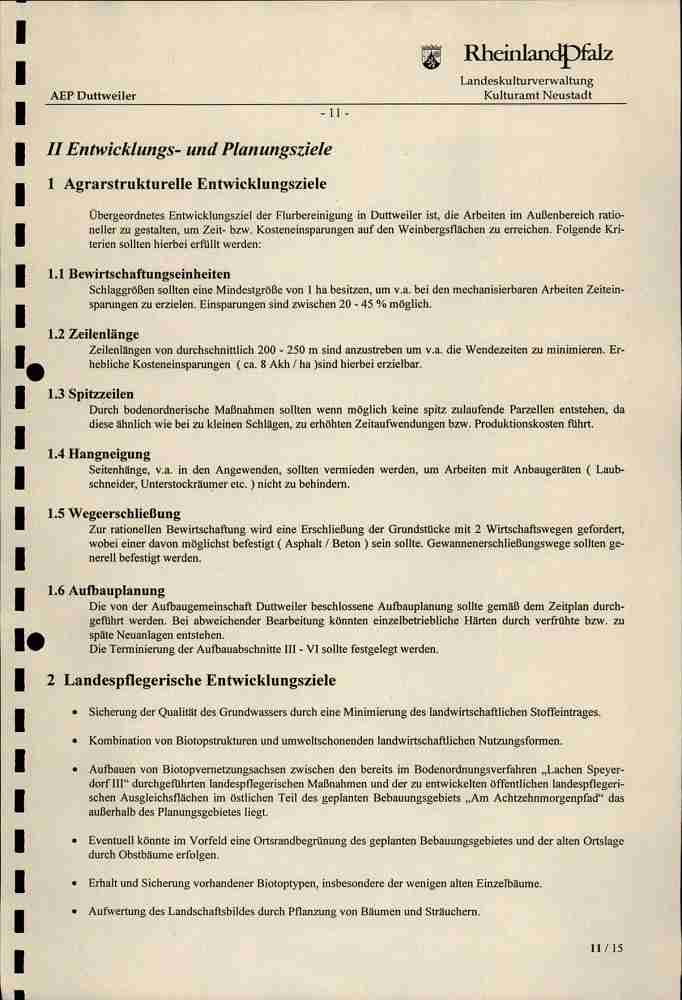 Aus Sicht der Bauern- und Winzerschaft Duttweiler sind Verbesserungen der Besitz- und Flurstruktur sowie am Wirtschaftswegenetz erforderlich, die eine umfassende Neuordnung der landwirtschaftlichen Nutzfläche erfordern.