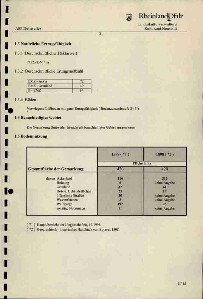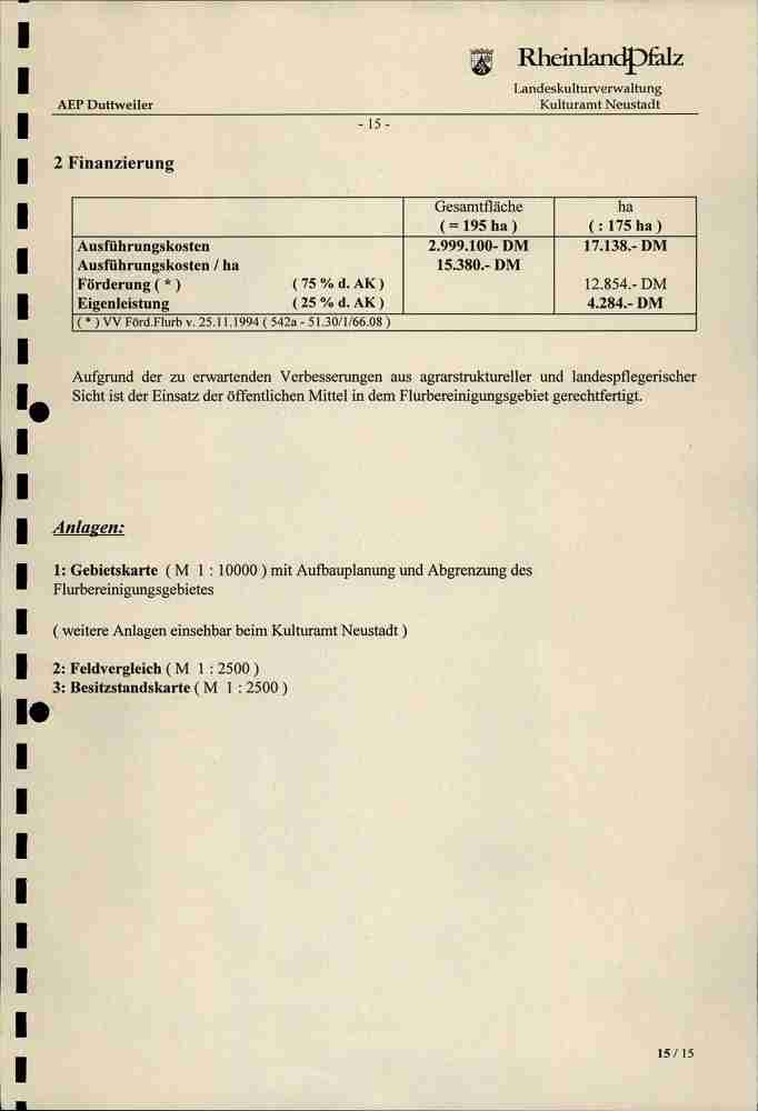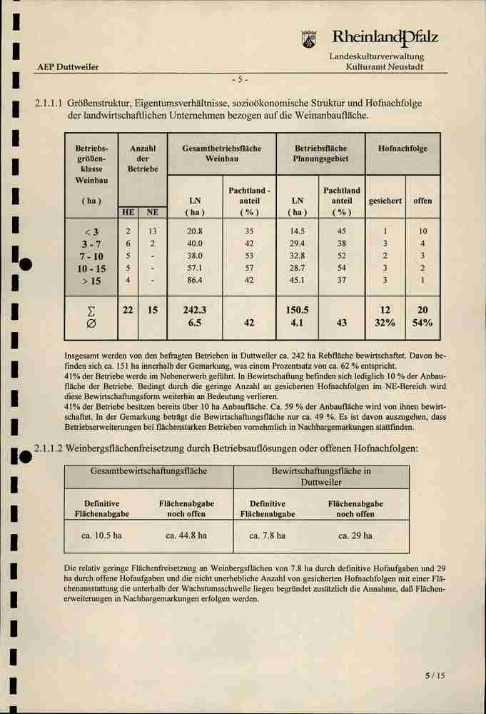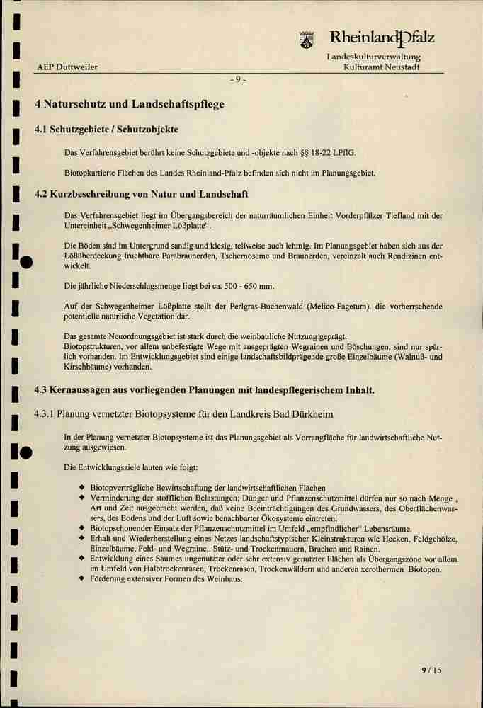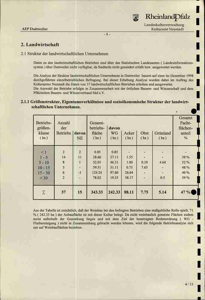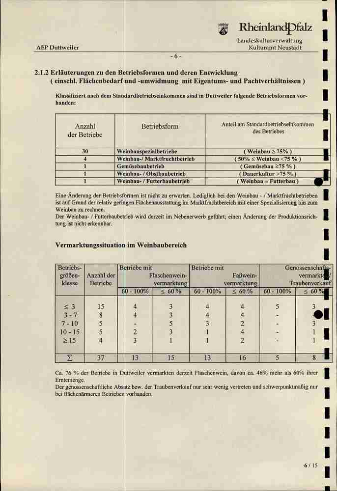 Aus Sicht der Bauern- und Winzerschaft Duttweiler sind Verbesserungen der Besitz- und Flurstruktur sowie am Wirtschaftswegenetz erforderlich, die eine umfassende Neuordnung der landwirtschaftlichen Nutzfläche erfordern.