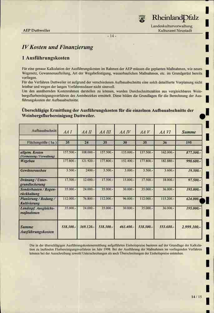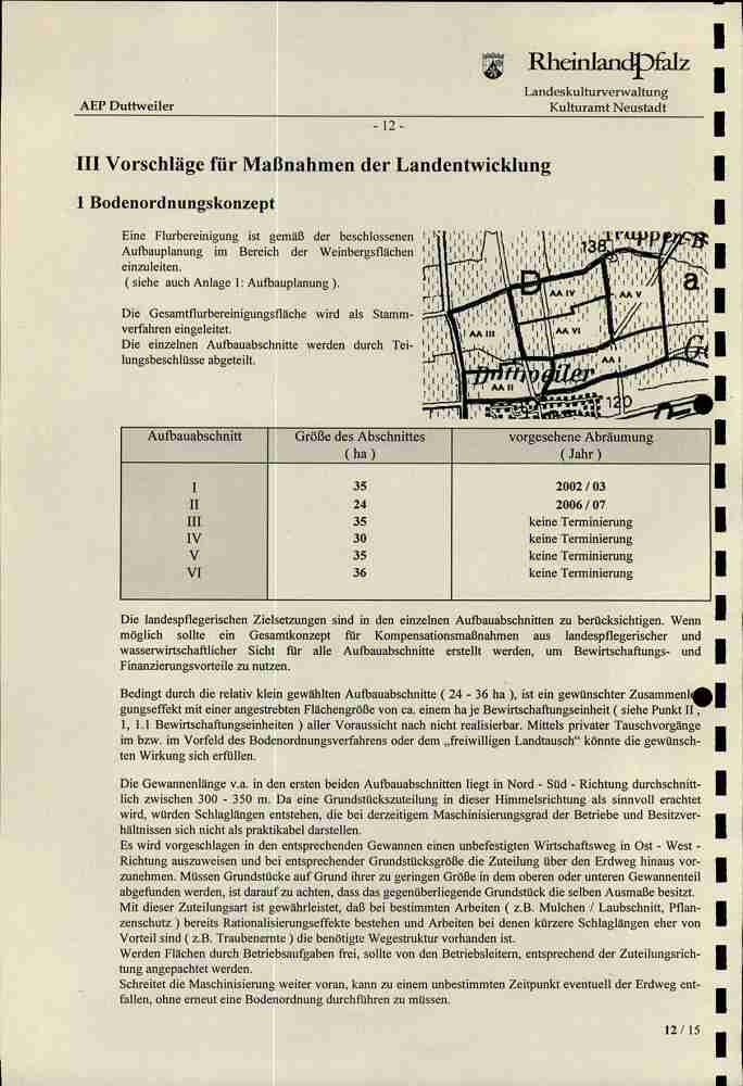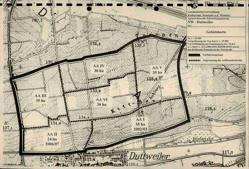 Die Aufbaugemeinschaft Duttweiler hat in ihrer Mitgliederversammlung am 29.03.1993 den planmäßigen Wiederaufbau der Rebanlagen der Gemarkung Duttweiler beschlossen. Eine zeitliche Festlegung der Aufbauabschnitte erfolgte für den Aufbauabschnitt I (2002 / 03) und II (2006 / 07).
