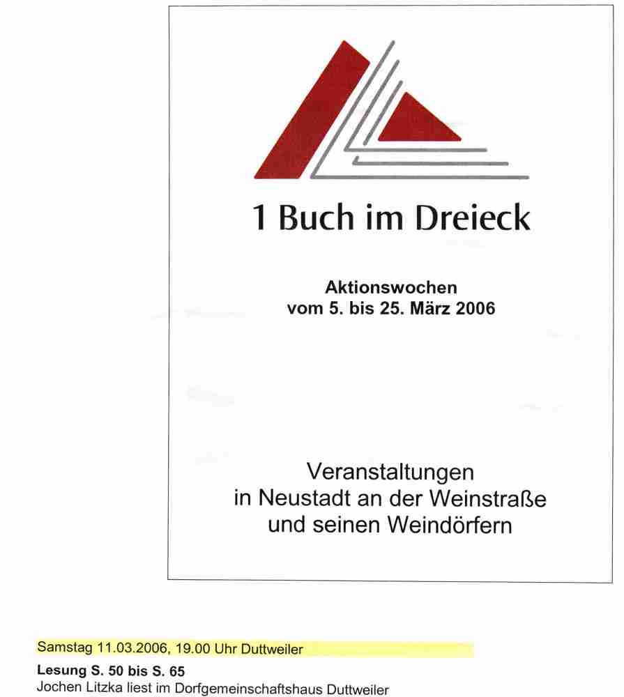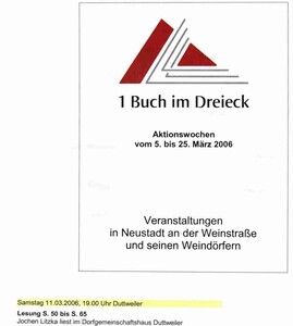 In Neustadt wird das Buch in verschiedenen Etappen vorgelesen. Die "Reise" beginnt im Ratssaal mit Oberbürgermeister Hans Georg Löffler und führt dann durch die neun Weindörfer. Am 11. März 2006 liest Jochen Litzka die Seiten 50 bis 65 im Dorfgemeinschaftshaus Duttweiler.