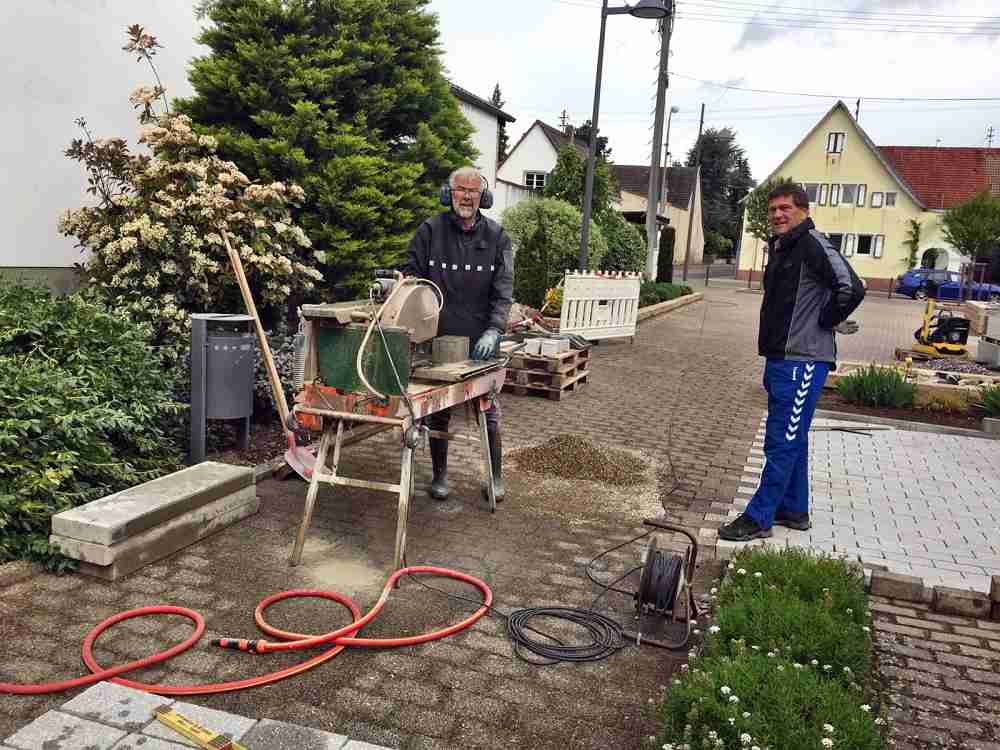 Dazu haben die beiden Dorfplatzbetreuer zuerst die Bodenfläche mit Hilfe des Baggerbetriebs Quell gepflastert und mit Unterstützung des Bildhauers Bernhard Mathäss drei mit Sitz- und Tischflächen versehene Gabionen aufgebaut.