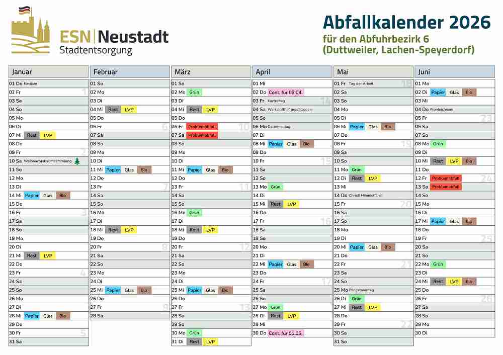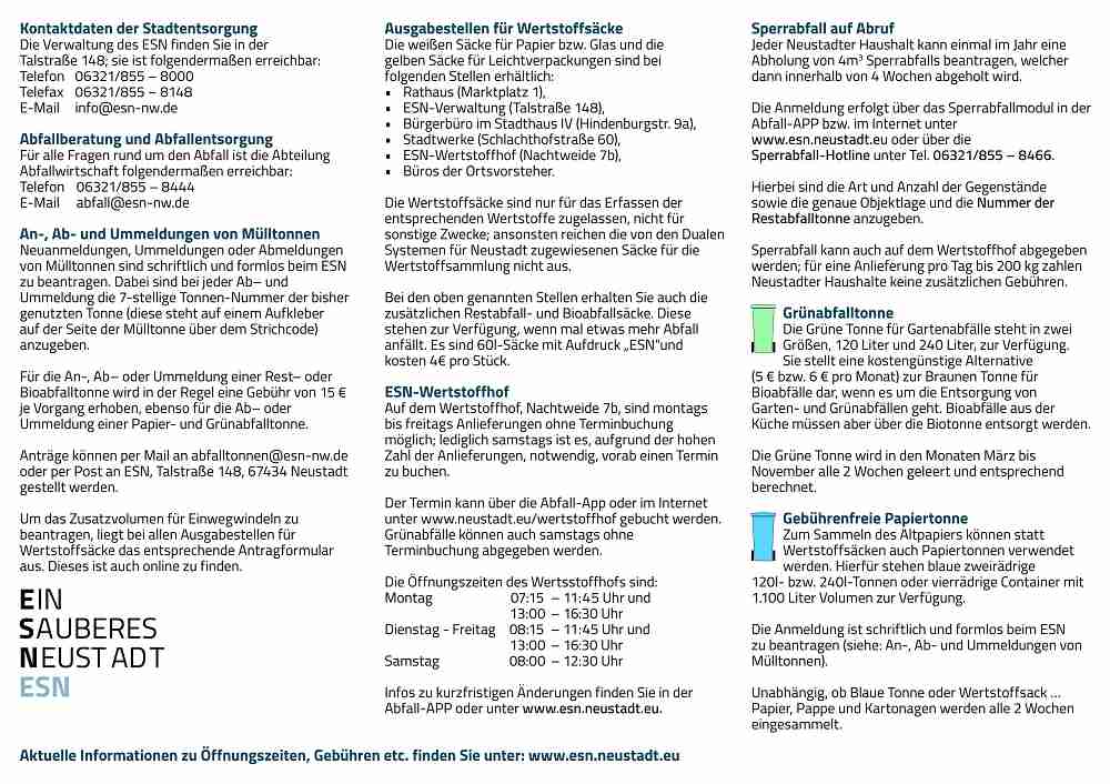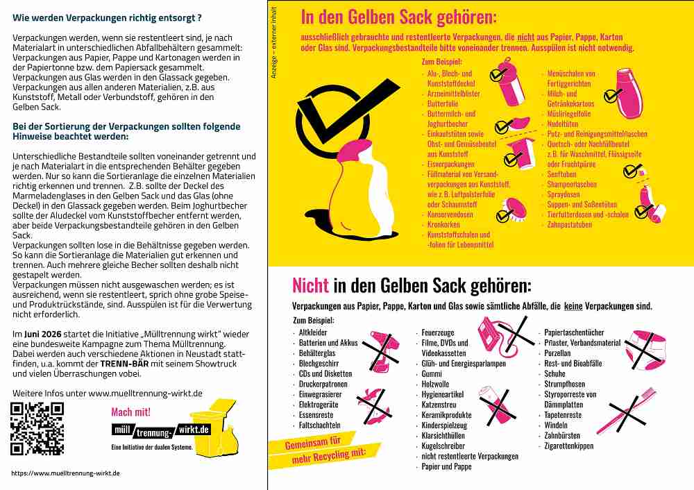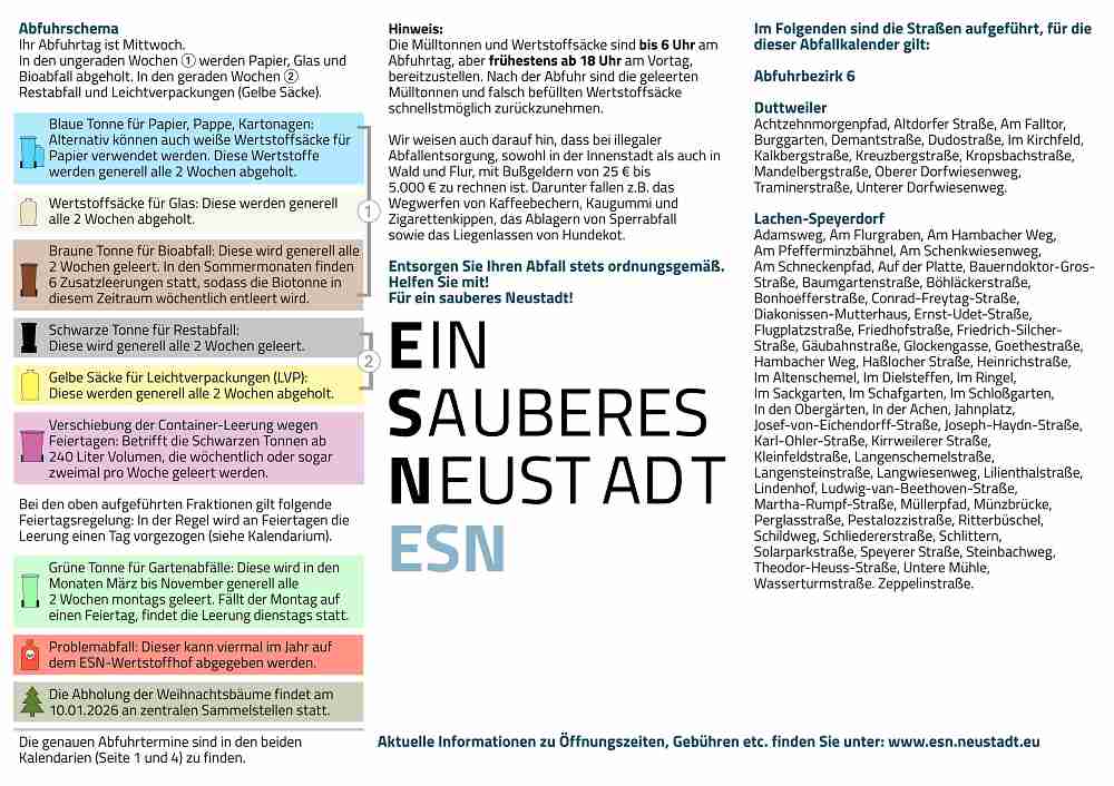 Neben den Abfuhrterminen für die verschiedenen Abfallfraktionen enthält er auch wieder diesmal wieder allgemeine Informationen zur Abfallentsorgung in Neustadt. Diese sind aber nahezu identisch mit der Ausgabe 2025.