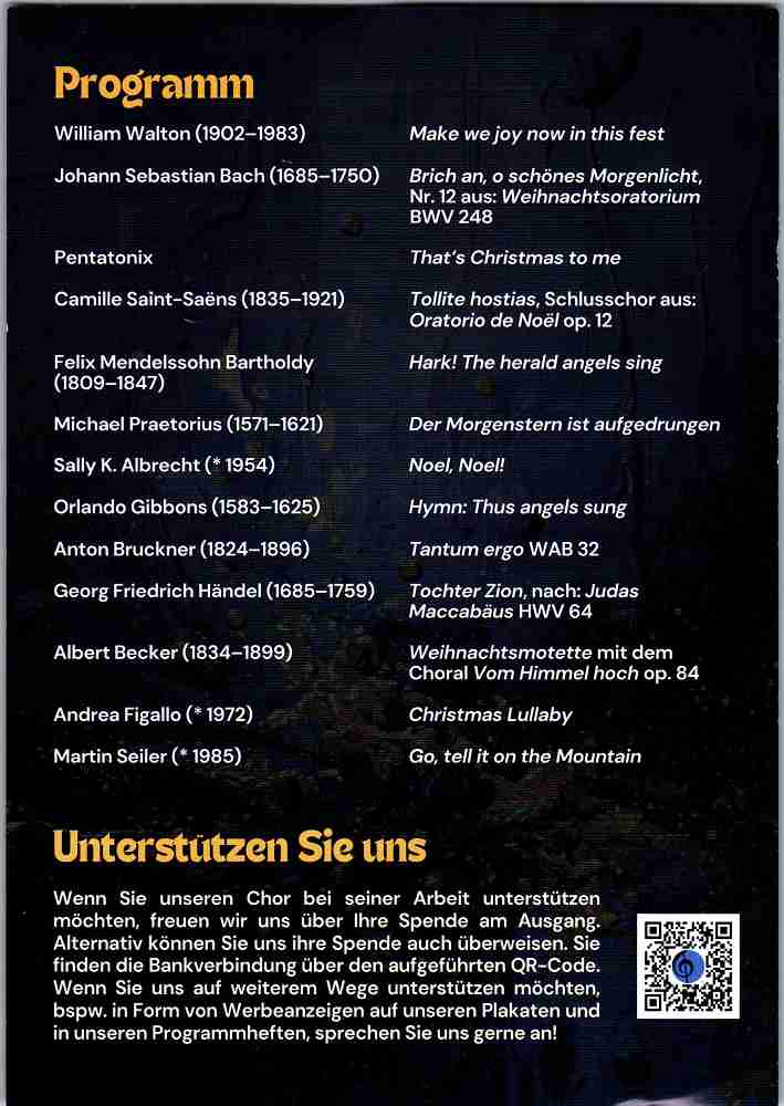 Musikalisch begabt sich der Chor auf eine Reise durch fünf Jahrhunderte weihnachtlicher Chormusik. Zu hören waren unter anderem Georg Friedrich Händels „Tochter Zion“, Johann Sebastian Bachs „Brich an, o schönes Morgenlicht“ sowie das moderne Titelstück „That’s Christmas to me“ der A-Cappella-Gruppe Pentatonix. Ergänzt wurde das Programm durch Anton Bruckners „Tantum ergo“ und den Schlusschor aus Camille Saint-Saëns’ „Oratorio de Noël“. Perpetuum Cantabile sang vollständig a cappella, zwischen den musikalischen Beiträgen wurden passende kurze Texte und Gedichte vorgetragen.