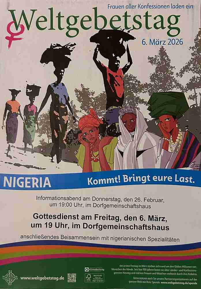 Am Freitag, den 6. März 2026, feiern Menschen in über 150 Ländern der Erde den Weltgebetstag der Frauen aus Nigeria. „Kommt! Bringt eure Last.“ lautet ihr hoffnungsverheißendes Motto, angelehnt an Matthäus 11,28-30.