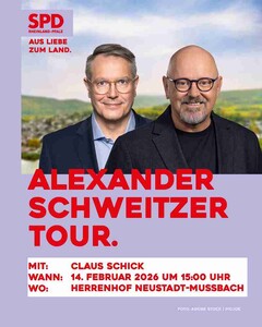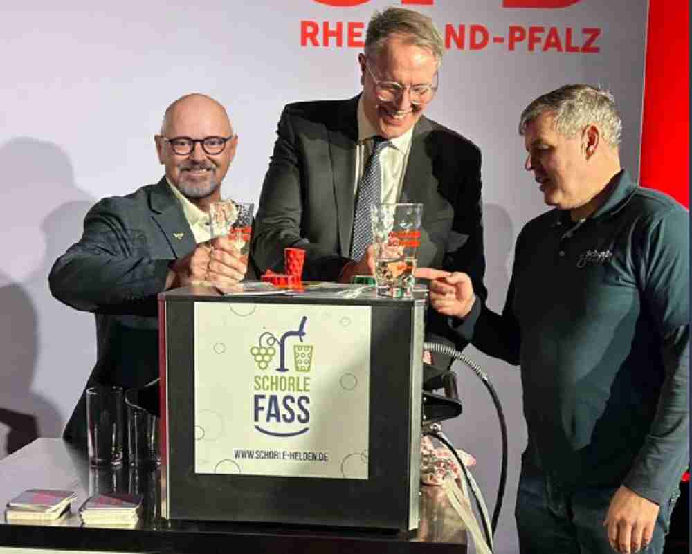 Ministerpräsident Alexander Schweitzer und der Wahlkreisabgeordnete Claus Schick warben für ihre Wiederwahl bei der kommenden Landtagswahl. Bei der Veranstaltung im Herrenhof Mußbach hat Jörg Walter von den Schorle-Helden nicht nur über die Nachhaltigkeit der Schorle aus dem Fass berichtet, sondern natürlich auch ausgeschenkt.
