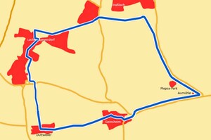 Start am Dorfplatz in Osten. Hinter dem Ortsausgang nach links auf den Wirtschaftsweg. Am zweiten betonierten Weg nach rechts nach Geinsheim bis zum Friedhof. Dort links in Richtung Haßloch vorbei an der Fronmühle mit ihrem historischen Mühlrad bis nach Haßloch.