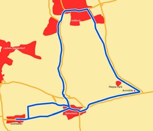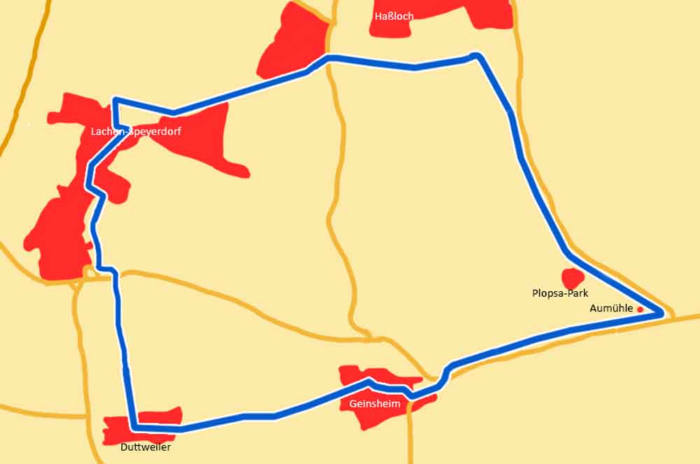 Weiter durch Speyerdorf entlang der Straße bis nach Haßloch, dort weiter durch den Wald bis zur Rennbahn. Rechts abbiegen, vorbei am Ponyhof und Plops-Park zur Aumühle mit ihrem historischen Mühlrad. Weiter nach Geinsheim und über die Landstraße zurück nach Duttweiler. Alternativ kann ab Geinsheim statt der Landstraße auch der etwas weiter nördlich gelegen Wirtschaftsweg benutzt werden.