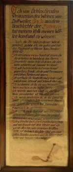 Die Proklomomation war auf eine etwa 1,80 m große Pergamentrolle geschrieben. Sie wurde nach der Krönung in einen Rahmen gefasst und zeitlebens im Haus von Gisela Hamann aufbewahrt.