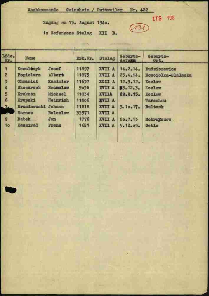Wachkommando Geinsheim-Duttweiler - Zugang Gefangene 13.08.1940