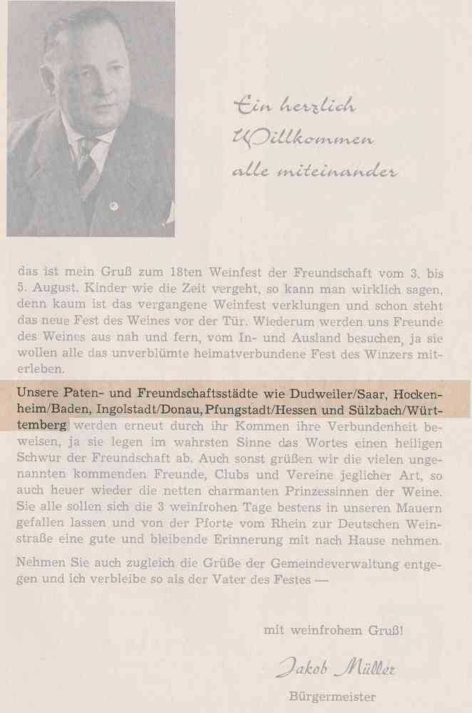 Im Festprogramm vom Weinfest 1963 ist eine Patenschaft mit Sülzbach in Baden-Württemberg aufgeführt. Weitere Belege zu dieser Verbindung liegen nicht vor.